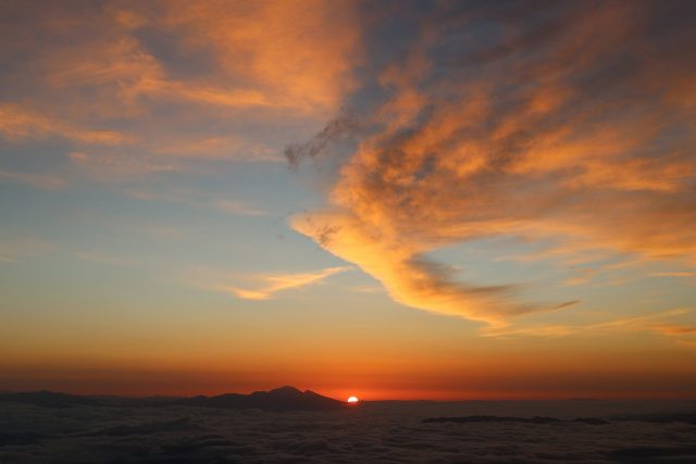 今朝は冷え込みました。玄関先の温度計は1.3℃。しかし、風はあまりなく、また湿度も高くなかったので、気温ほど寒くは感じませんでした。同じ気温でも湿度が高いと寒く感じるものです。御来光は美しく雲も紅く染まり素敵な朝でした。