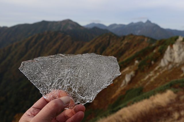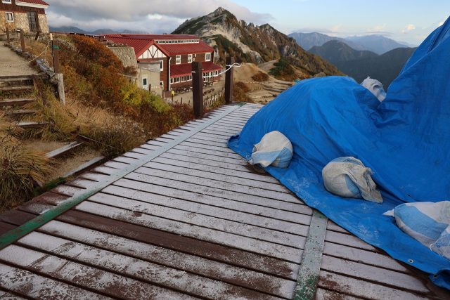 これだけ冷え込めばもしかしたらと、小屋周りを歩けばヘリポートは霜で白くなっていて、またその近くにある水のたまったドラム缶の上には氷が出来ていました。燕山荘での初霜、初氷です。昨年は10月10日だったので1週間くらい早くなりました。秋が深まっていきます。