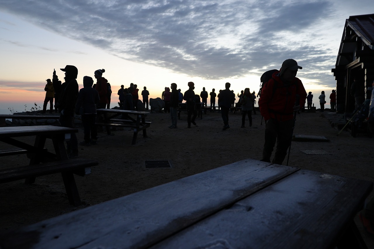 今朝は雲が少し多く太陽は遅れて登ってきました。先日ほどの冷え込みではなく、氷は張りませんでしたがベンチにはびっしりと霜がついていました。