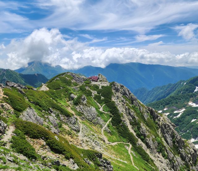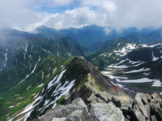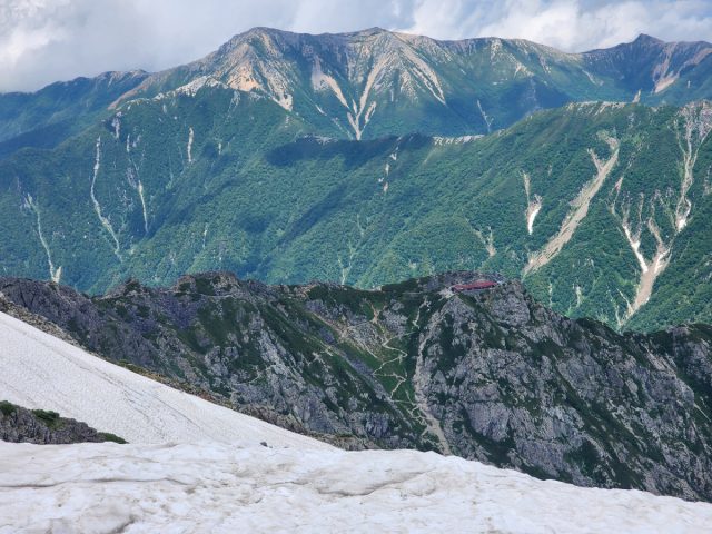 大喰岳と中岳の間からの写真です。大天井岳や表銀座の稜線を背景に小屋もよく見えます。