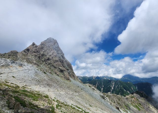 槍ヶ岳と大喰岳の間からの写真です。右下に小さくヒュッテ大槍があり、槍ヶ岳の大きさが目立ちます。