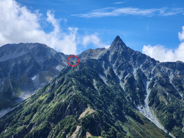 最後に西岳近くの稜線から見たヒュッテ大槍です。小屋が小さく見えにくいのですが、画像の赤丸あたりに小屋があります。東鎌尾根のキツイ登りの後に小屋があります。