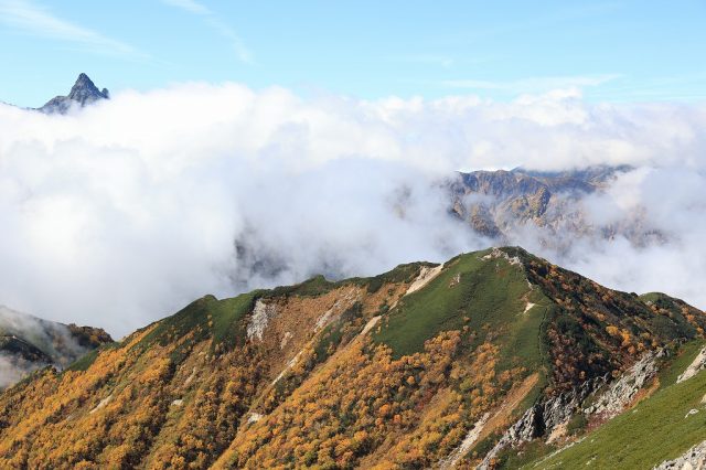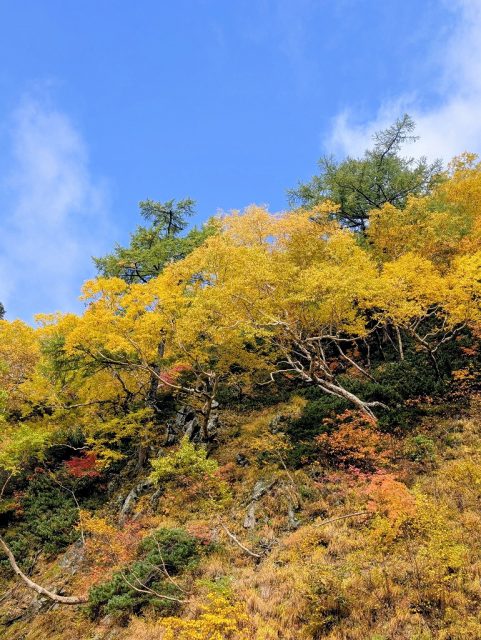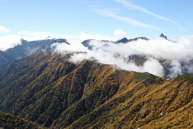 槍・穂高方面に目を向けてみると、雲が少しかかっていますが、こちらも見事な紅葉♪