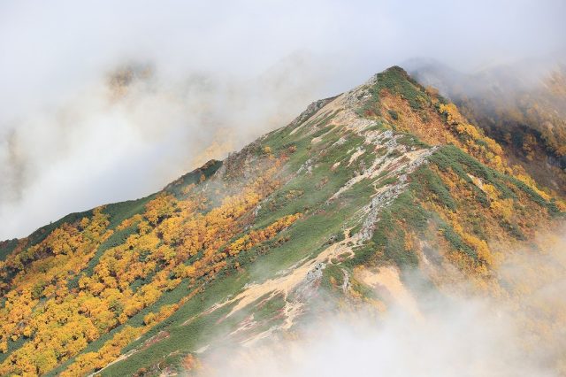 今年は紅葉が当たり年と言われていますが、大天荘から見た燕山荘への稜線も秋色に染まっています。
