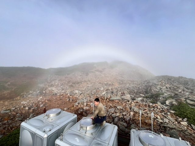 タンクを点検する支配人を囲むように白い虹がでていました。