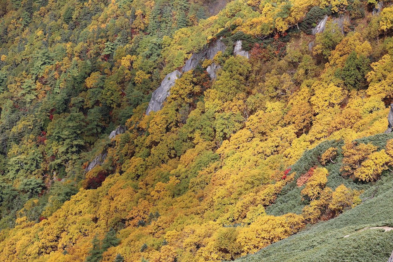 雨が続きましたが10時過ぎよりガスも切れ、展望が突然広がり始めました。この周辺の紅葉はこの雨で見頃は過ぎてしまいましたが、下へと下りて行く紅葉がとてもきれいでした。特にダケカンバの黄色がとても色鮮やかでした。