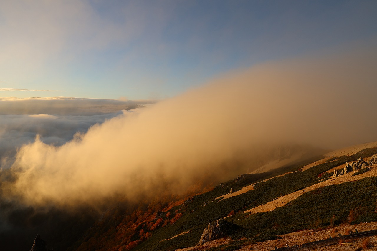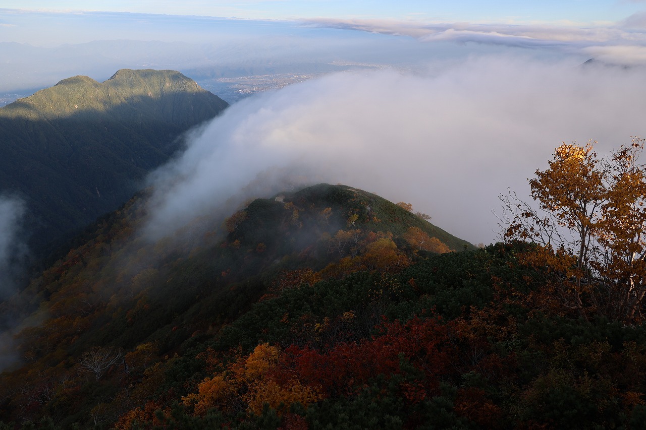 その安曇野側のガスも日の入りが近づくと急に動き始めてきました。合戦尾根を南から北へと流れるガスがとても素敵でした。紅葉した木々とガスの組み合わせはなかなかいいものです。