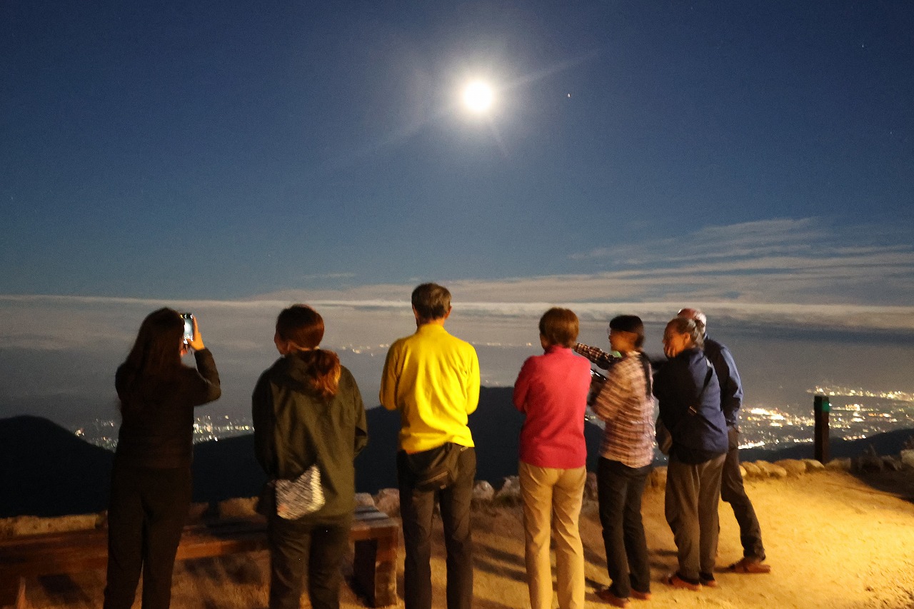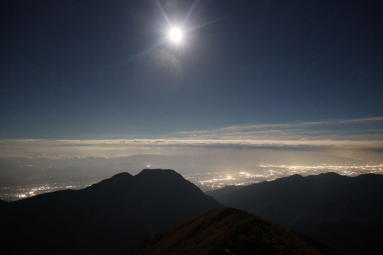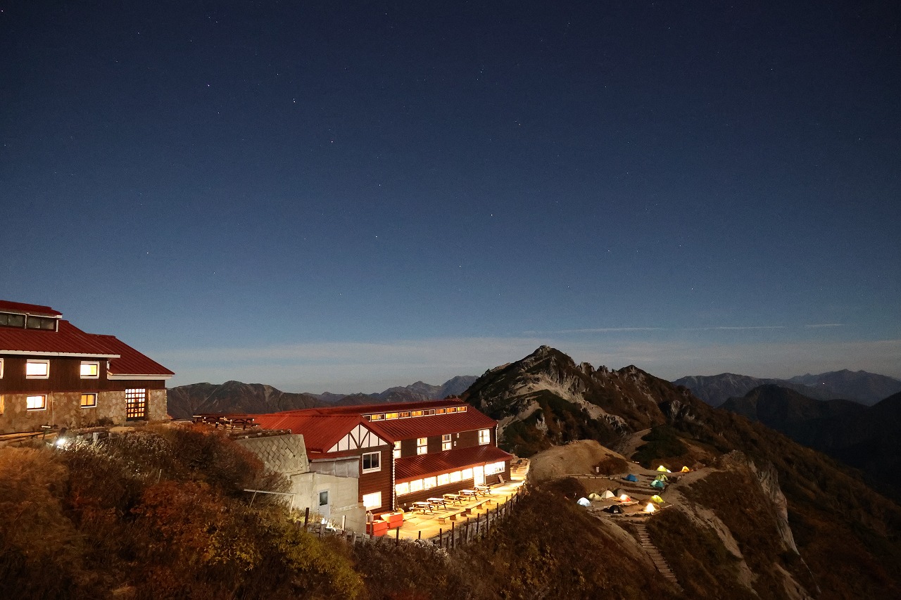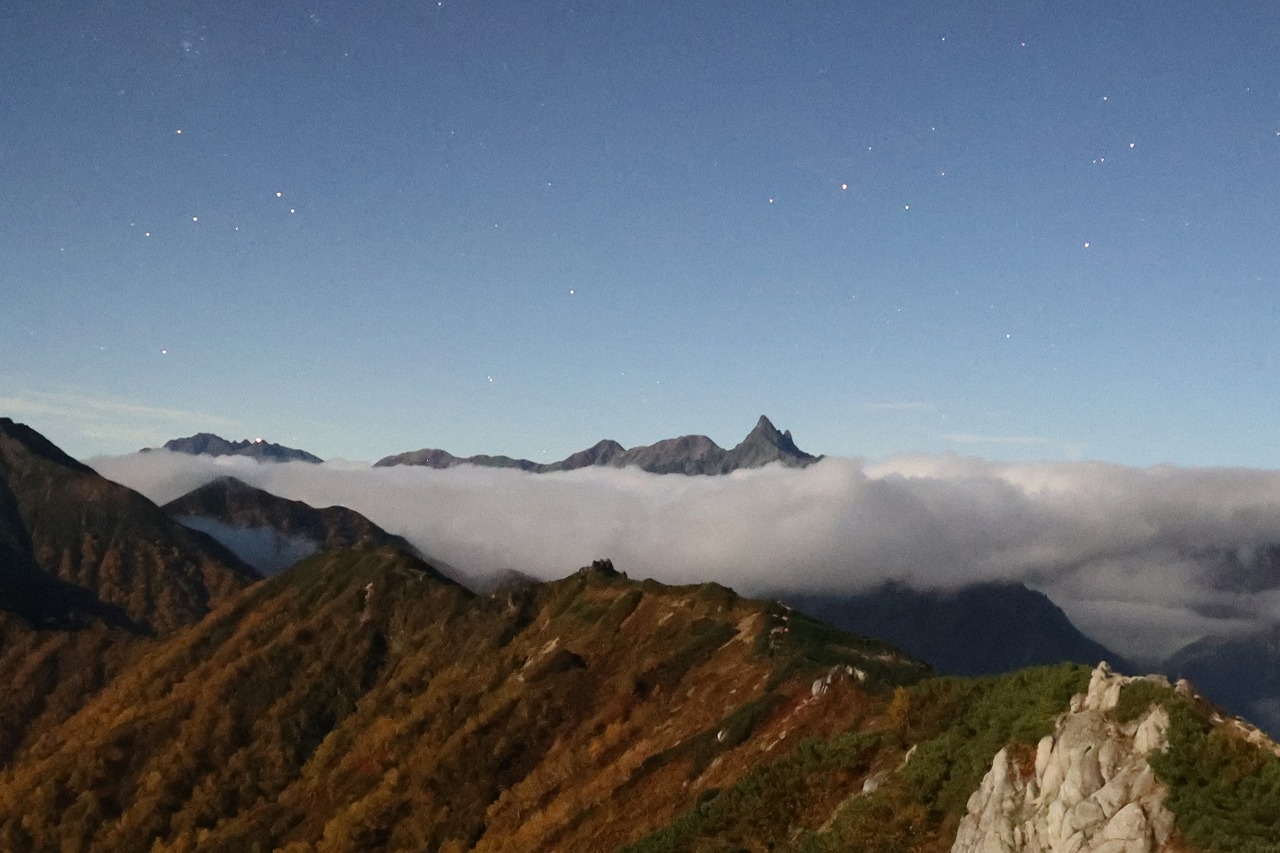 満月は明日の夜となりますが、満月頃の月明かりがとても明るく、写真を撮るとまるで昼間のように映ります。槍ヶ岳の真上辺りには夏の星座のさそり座が、燕岳の左斜め上には北斗七星も見えていました。紅葉と中秋の名月を同時に楽しむことが出来た素敵な一日でした。