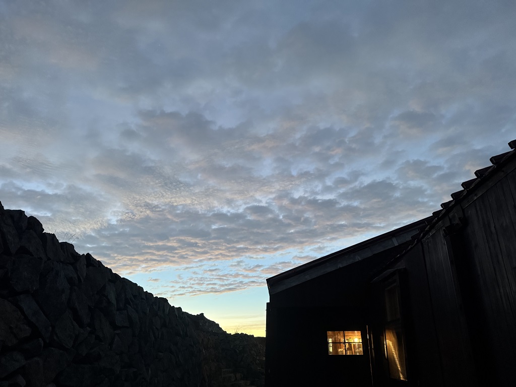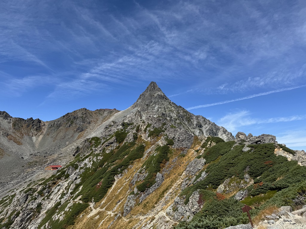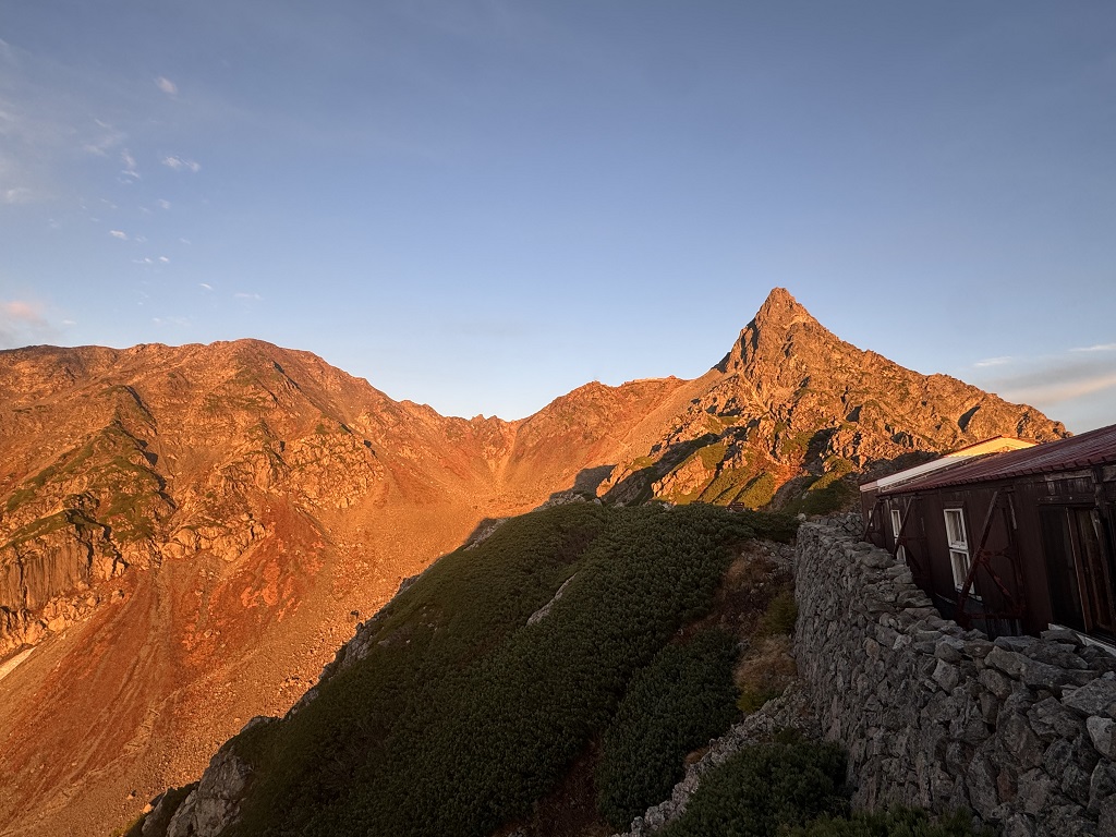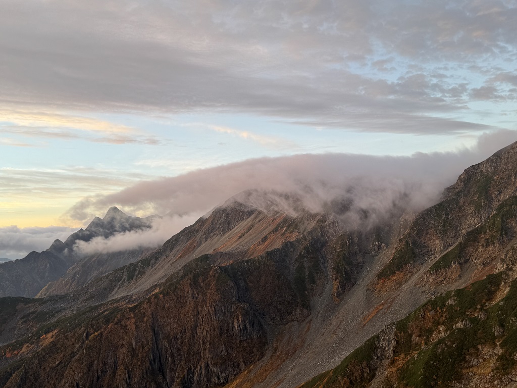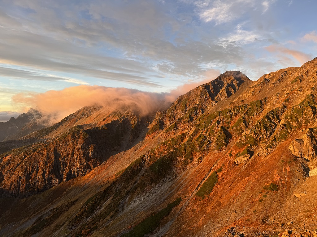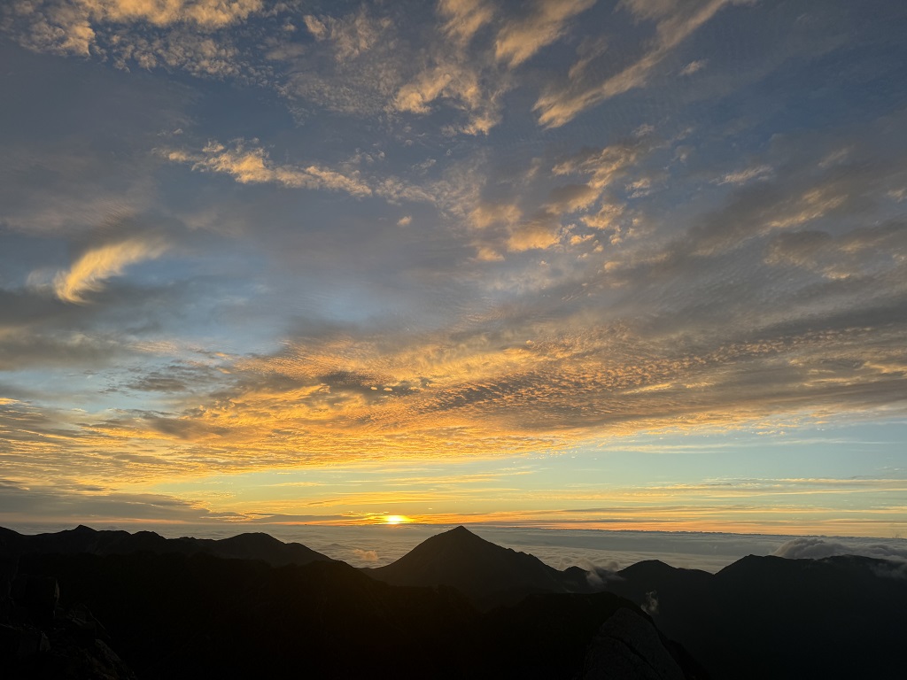 5時50分、うろこ雲が金色に変わり、ヒュッテ大槍に太陽の温かさが届きました。
