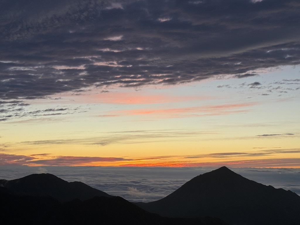 常念岳の少し左側が一際明るく、太陽がもうすぐ顔を出しそう。