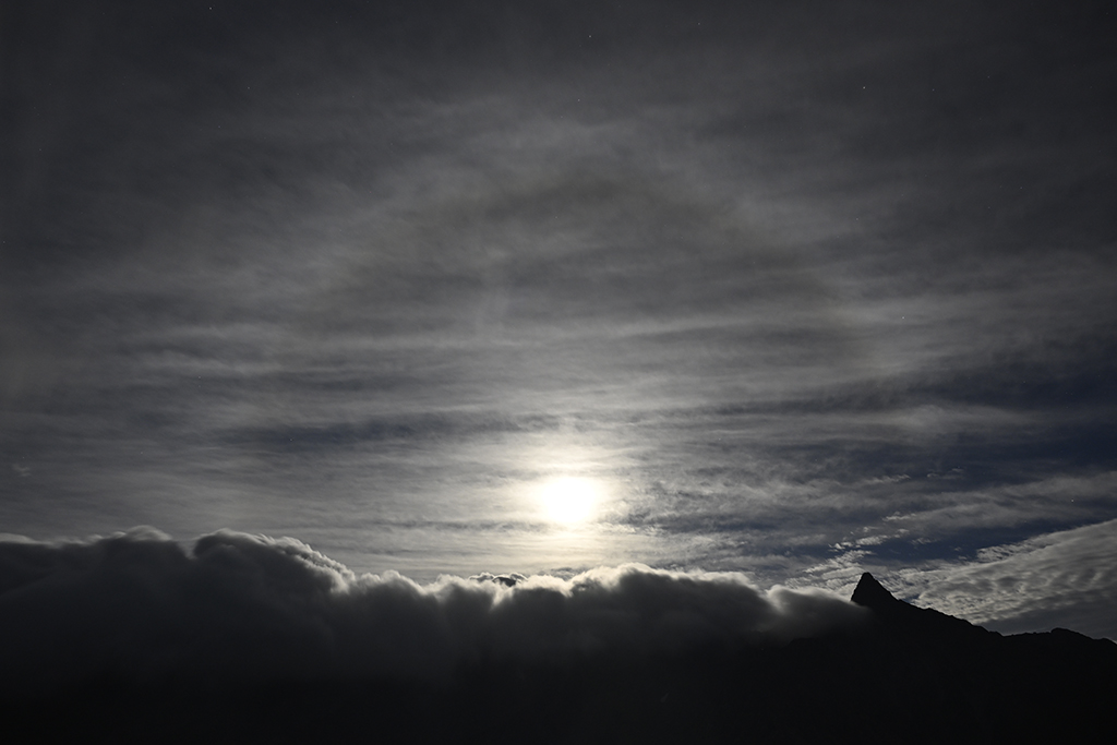 今日はこんな光景も、満月と月暈と槍ヶ岳。