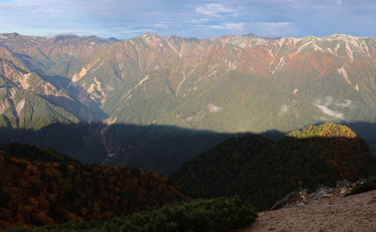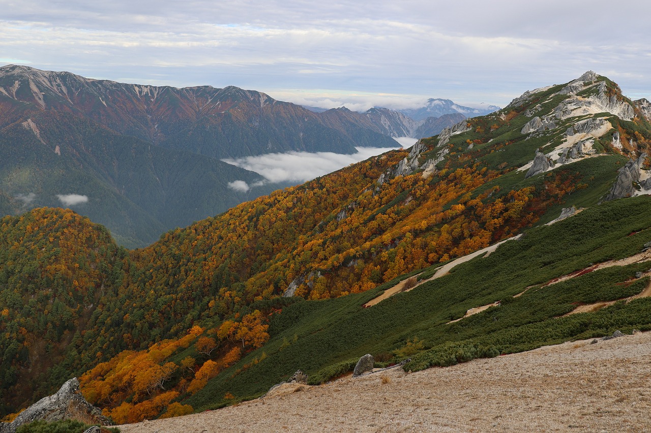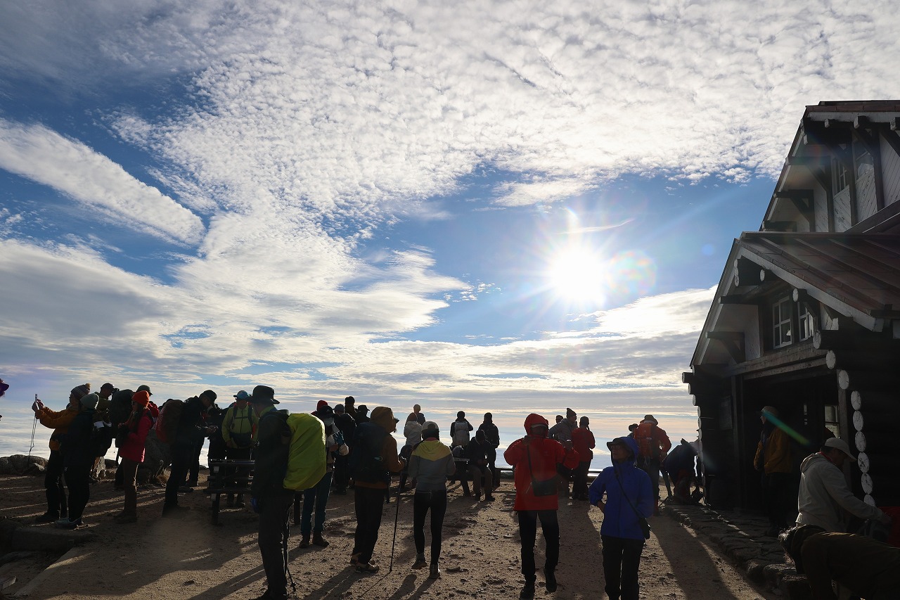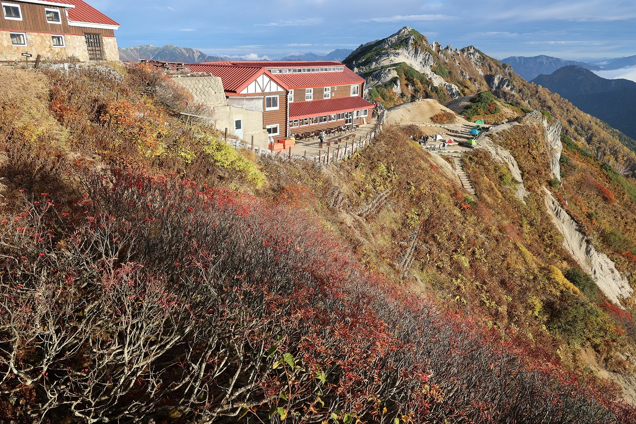 昨日は海外の方が半数以上でしたが、その皆様も今朝の光景には大変喜ばれていらっしゃいました。そして、雲間から差し込む光の加減がよく、野口五郎岳から双六岳にかけての山々の紅葉がとても美しく見えました。この紅葉のラインは今は2700mより下辺りに出来ていますが、これからどんどんと下へと下りて行きます。