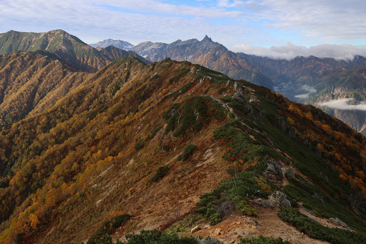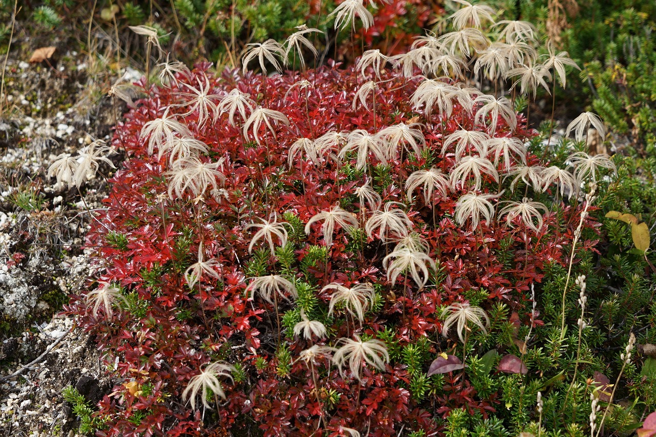 今日は用事があって、北燕岳の先まで行ってきました。夏はお花畑のこの辺りも今はすっかり秋枯れの景色となっていました。そんな中、紅葉したチングルマの葉っぱがとてもきれいでした。胞子と紅葉した葉っぱが同時に見られるのは今のタイミングしかなく、ちょっとうれしくなりました。