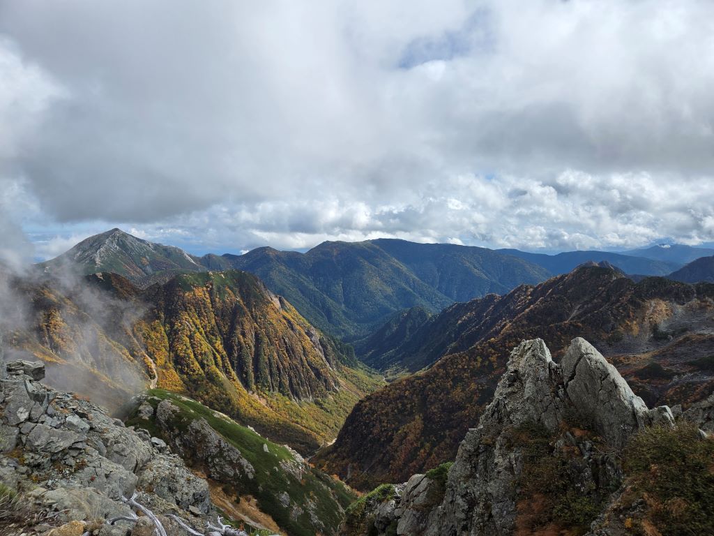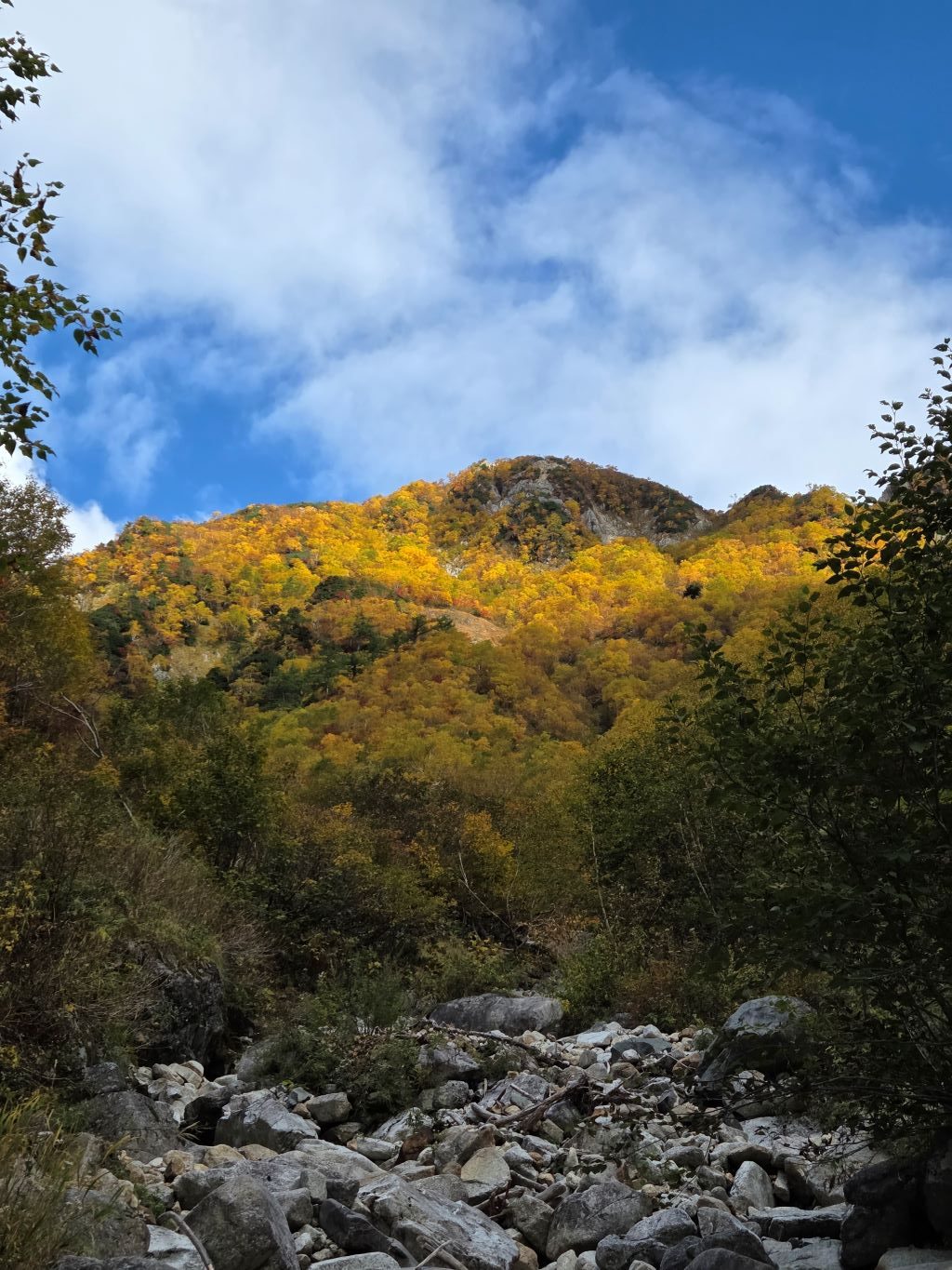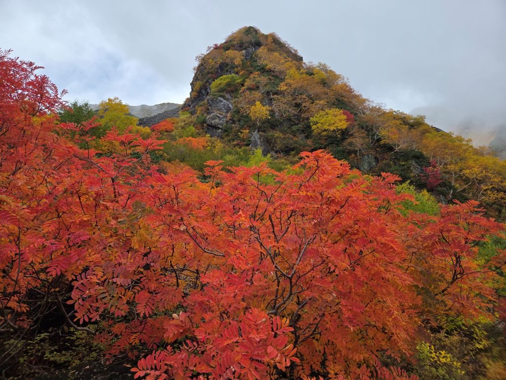 赤や黄色に染まった山肌が秋の陽射しに照らされ、登山道を歩くだけで心が和みます。
