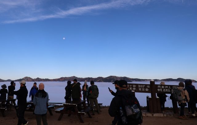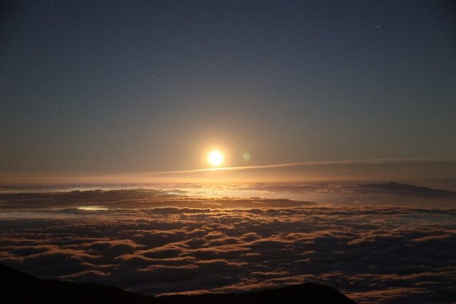 日が沈んでも雲海は広がり続け、その中から満月を少し過ぎた月が昇ってきて、雲海を美しく照らしていました。今日は山の上でしか味わえない素敵な一日となりました。