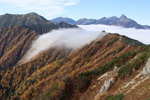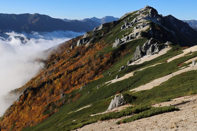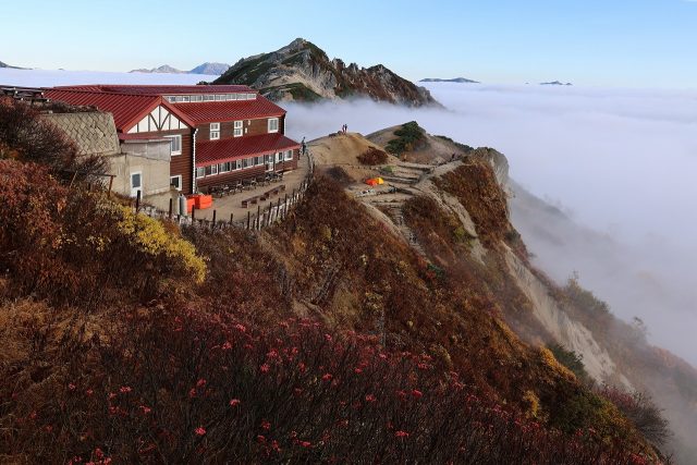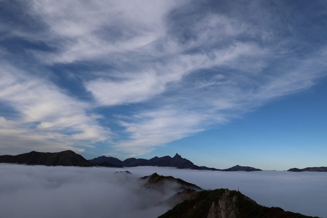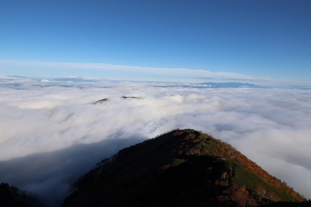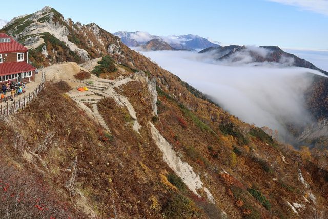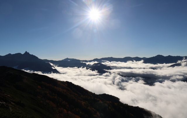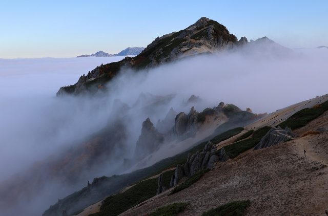 ヘリポートから眺めると燕岳の頭だけ雲の上に出ているのがわかりました。これもなかなか見られる光景ではありません。今朝はカメラを持ってあちこち駆け回る忙しい朝となりました。