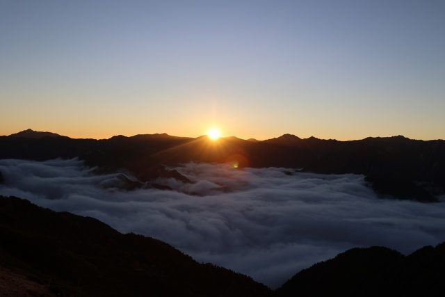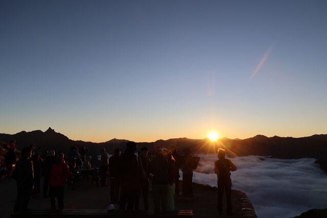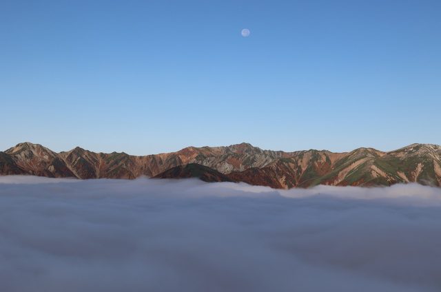 最初の頃は安曇野側はまだ展望はなかったのですが、反対の高瀬側はいつもと比べてかなり高い位置で雲海が広がり、また、水晶岳の上には月がまだ見えて、息をのむほど美しい光景が広がりました。ひとシーズン山で働いている我々スタッフでも1年に一度見るか見られないかの素晴らしい光景でした。