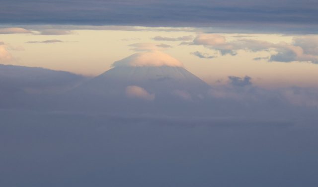 昨日もちょっと面白い富士山を見ることが出来ましたが、今日もまた面白い富士山を見ることが出来ました。これも台風の遠い影響を受けてのことでしょうか、山頂にはレンズ雲がかかり、それがまるで雪のように見え、富士山には雪が降ったのですかという質問を何度も受けました。