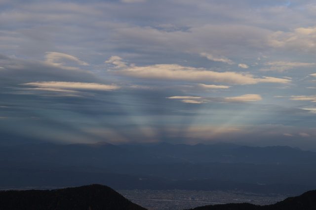 雲の多くなってきた午後、安曇野側を見ると美しい反薄明光線が見られました。この現象は太陽と反対の方向に見られます。