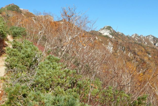 ダケカンバは落葉が始まり出してきていますが、カラマツの黄葉はもう少し先となりそうです。合戦沢の頭の少し上にある「お褒めの松