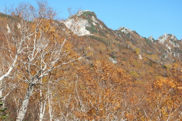合戦沢の頭より下まで来ると、まだダケカンバの黄葉を楽しむことが出来ます。今日の午前中は青空が広がり、そのコントラストがきれいでした。