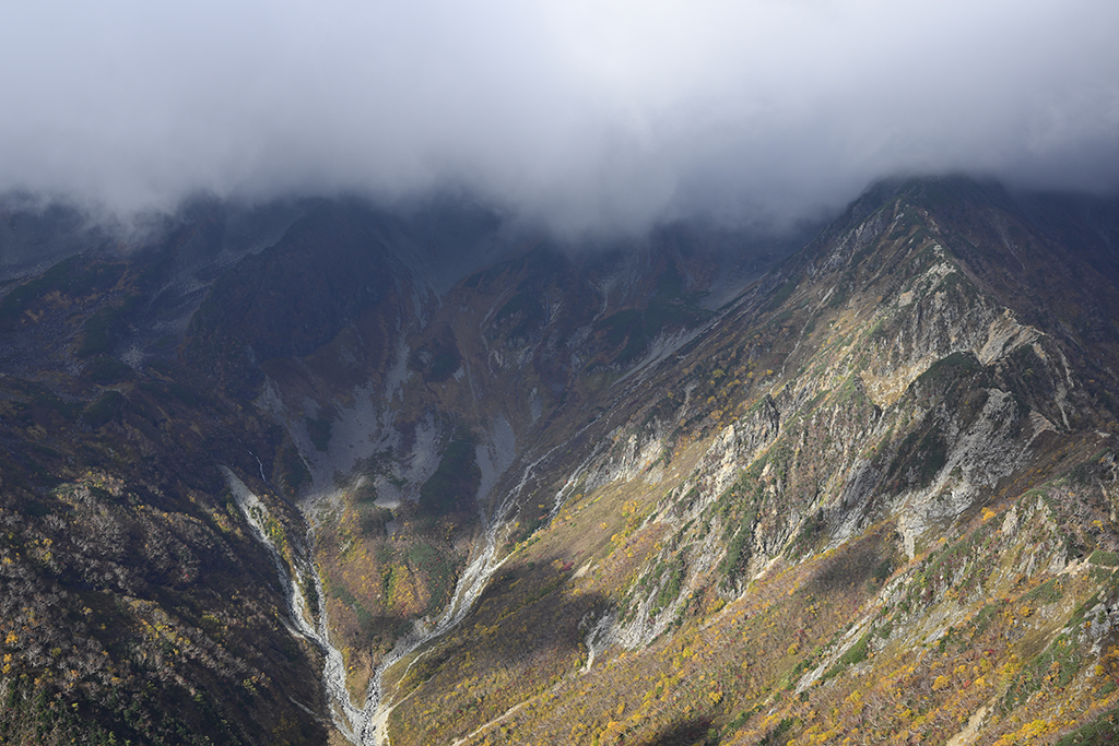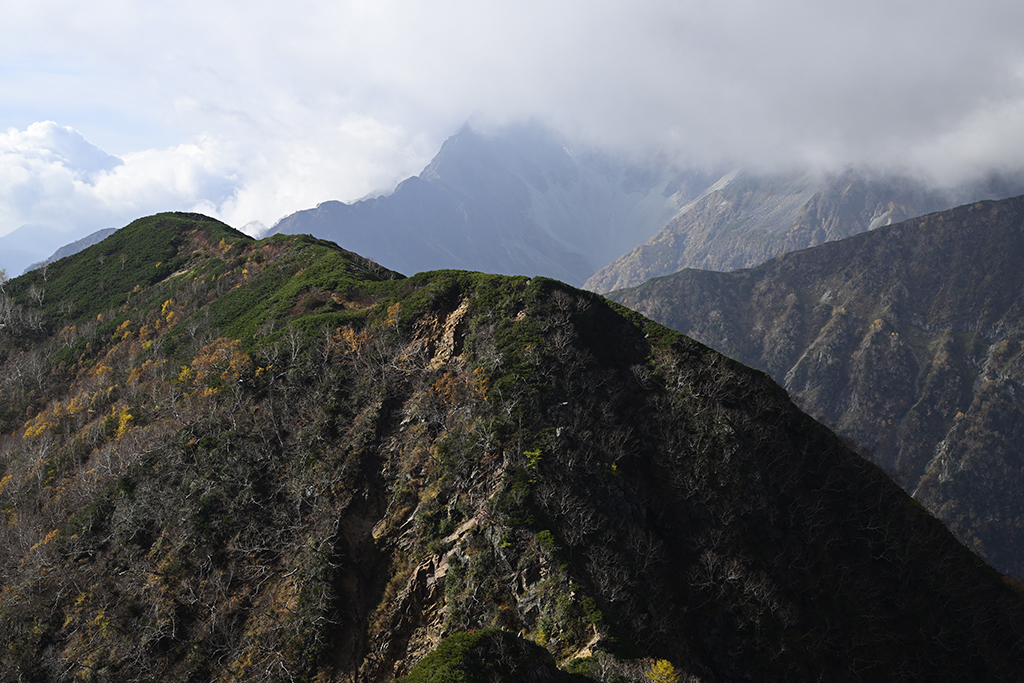 風がまだ少し強くて槍穂高の稜線は雲の中。
