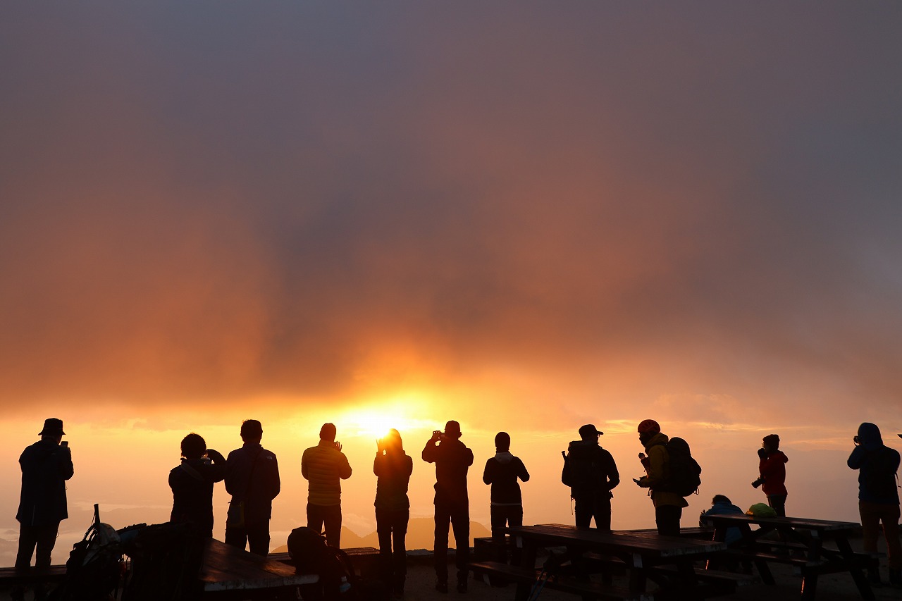 朝になると昨日の雨が上がっていて、ガスが多かったのですが、そのおかげで幻想的な御来光を見ることが出来ました。昨日の冷たい雨の中を来られた皆様にとっては最高のご褒美となったのではないでしょうか。