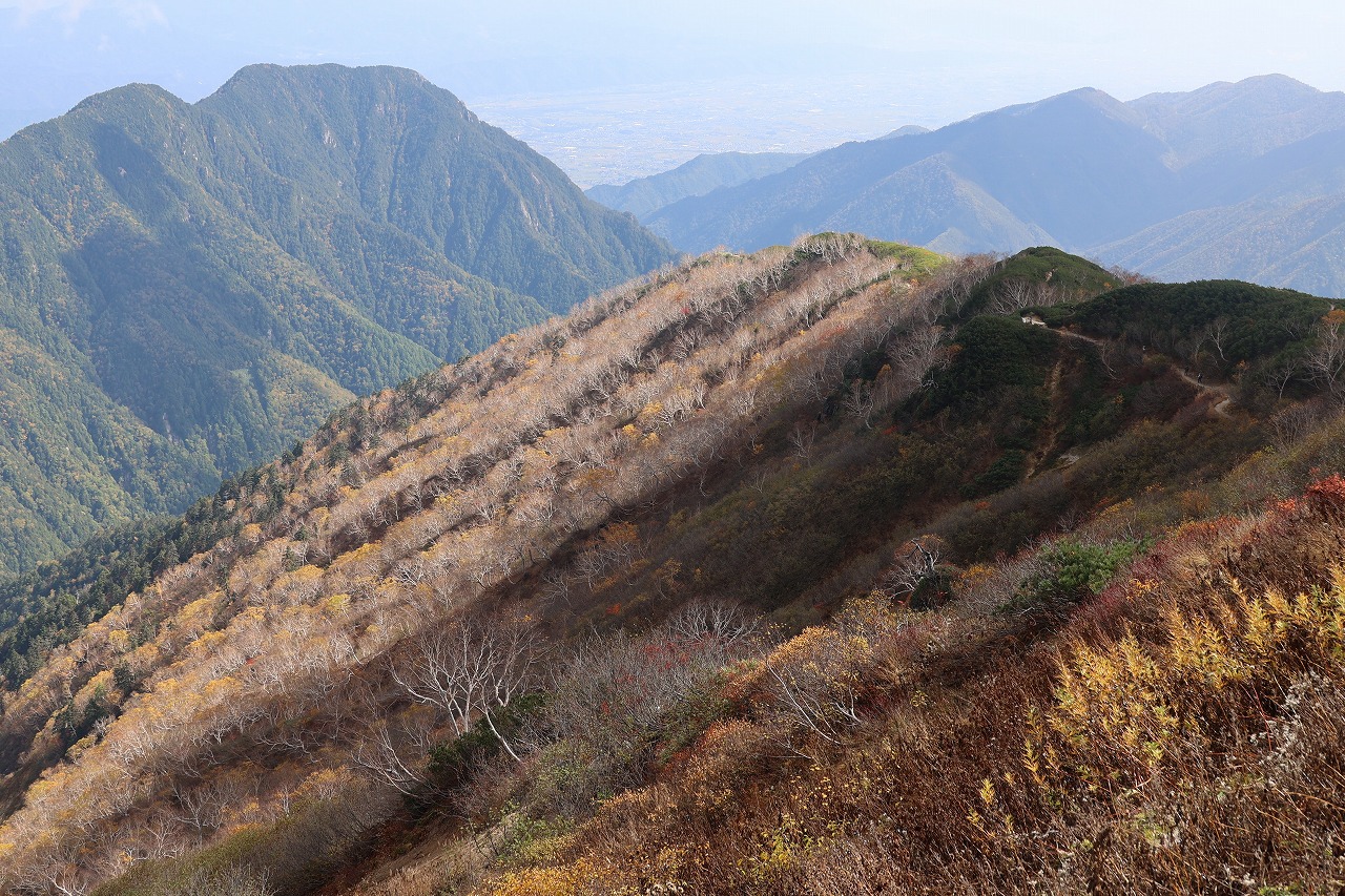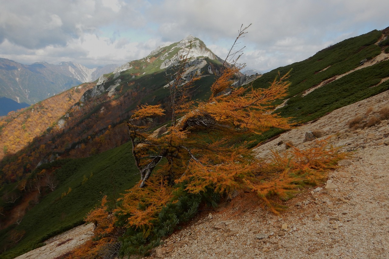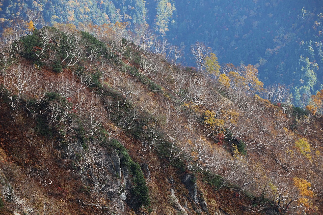 稜線上のダケカンバが黄金色の美しい色に変わってきています。この木の育ち方を見ると風向きも予想が出来ます。