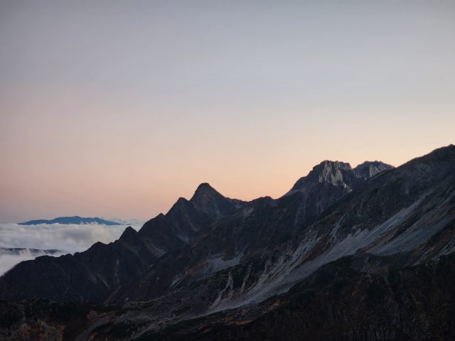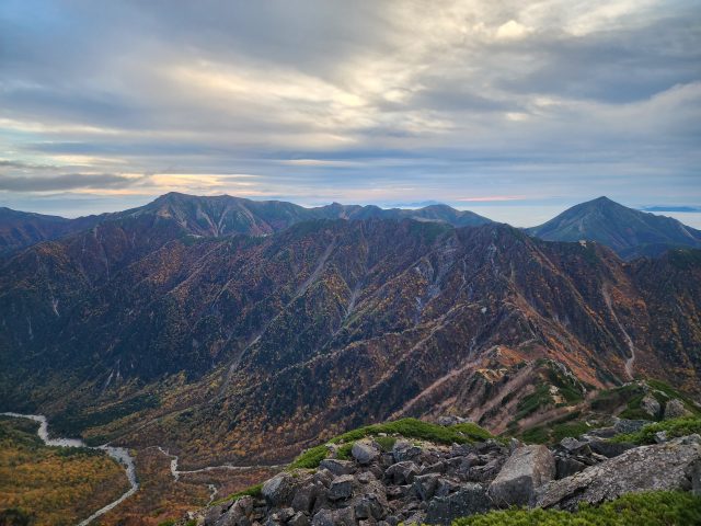▲朝の大天井岳と常念岳方面。紅葉のピークは過ぎましたが、まだ秋の色合いが残っています