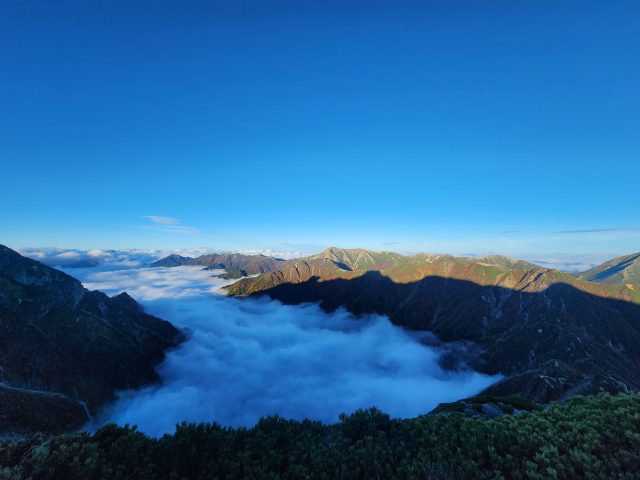 ▲16時30分頃。雲海・紅葉と稜線の影、青空のコラボが見事です