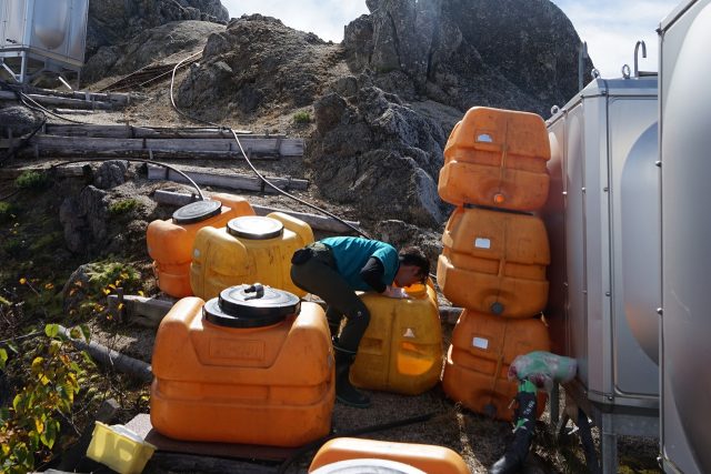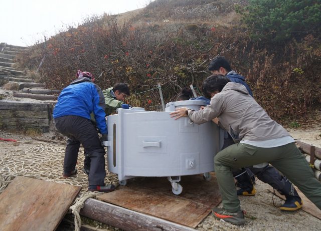 テント場のトイレのし尿タンクを今週予定のヘリで下げるため、その準備を行いました。し尿がたくさん入ったタンクはとても重たく、男性スタッフ大勢で運びました。これに伴い、今シーズンのテント場トイレは終了となりました。テント泊の方は小屋のトイレをご利用頂くこととなります。この連休が終わると冬はもうすぐそこまで迫ってくるので、様々な冬支度の作業の日々が始まります。