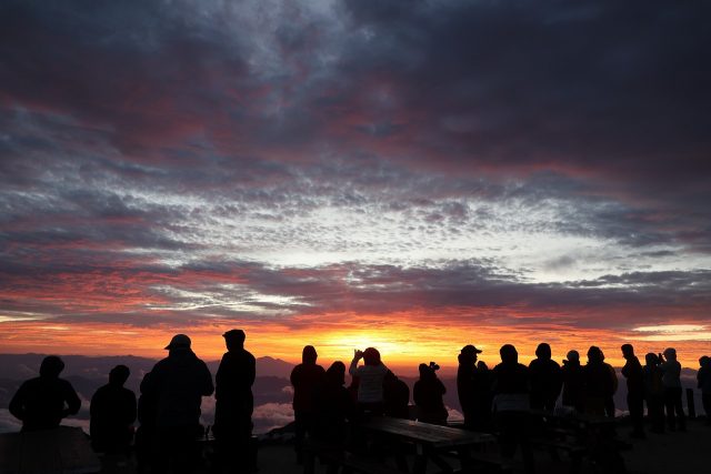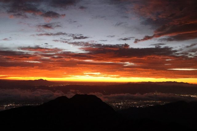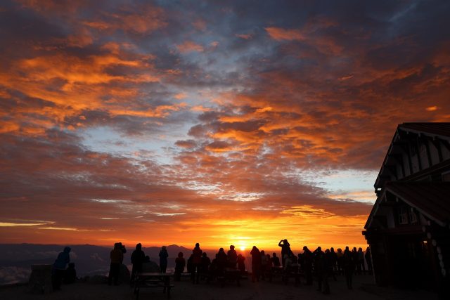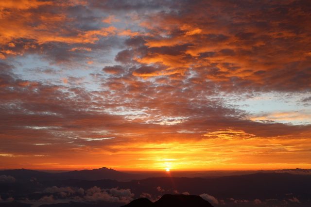 そして、6時ちょっと前、太陽が顔を出すと赤く焼ける雲は再び増えて、今朝の朝焼けの最高点となりました。とても美しい朝焼けでしたがこのようなものが見られる時は空気中の水蒸気が多くなっていることが多く、悪天の前兆ともとらえることが出来ます。台風接近時などにも見られることがあります。実際、今日は朝から非常に強い風が吹いていて場所によっては歩くのが困難なほどでした。前線の接近によるものと思われます。それにしてもすごい風でした。その風が小屋のどこからとも入り込んできて、気温以上に寒く感じました。