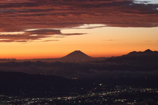 夜明け前、まだ街の灯り結構残っている頃、東の空が白みだしてくると早くも雲が赤くなり始めていました。日の出時刻の1時間以上前にこんな光景が見られました。この後の日の出が楽しみになってきました。