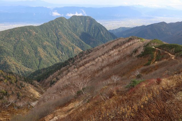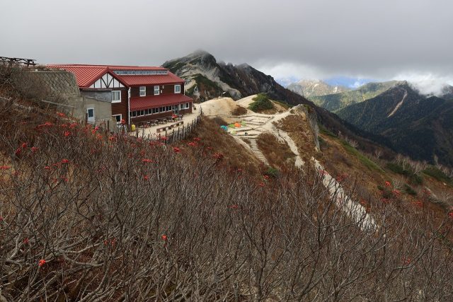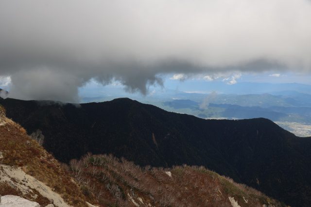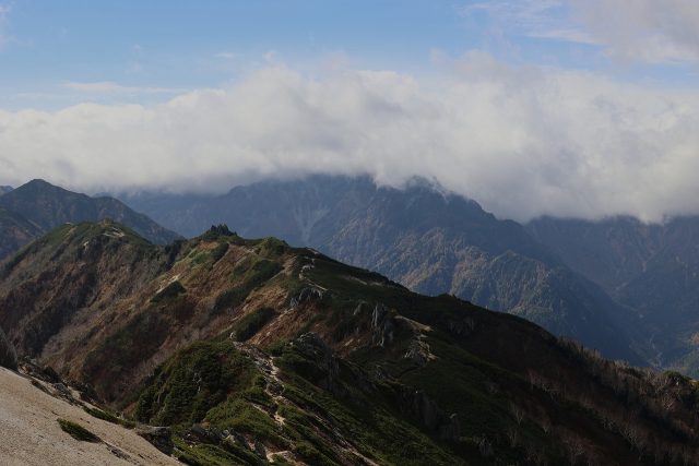 風は強かったのですが意外と天気はもってくれ、安曇野側はきれいに見えていました。一方、その反対の槍方面などには雲がかかり続けていました。合戦尾根の上部のダケカンバの葉っぱはすっかりなくなってしまったようです。この周辺の紅葉は今登山口辺りまで達しているようです。