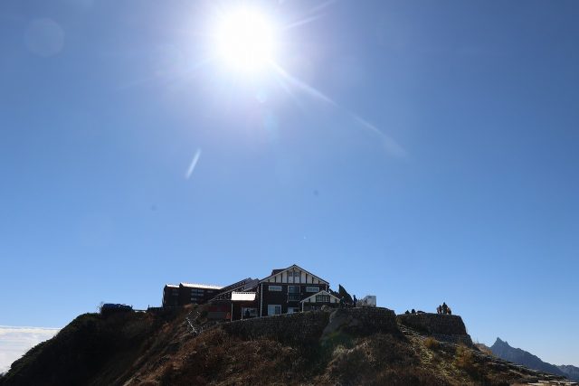 ちょうど正午の時の写真です。太陽の光が降り注ぎ、また風も弱く、日差しの下ではぽかぽかと暖かく気持ちのいい天候でした。山の上ではこんなにいい天気なのに、雲海がとれなくて結局ヘリコプターによる荷上げはかなわず。なんともせつない晴れです。