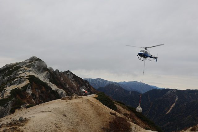 そして、待ちに待ったヘリコプターによる物資輸送が始まりました。小屋締めとなった今年から燕山荘グループになったヒュッテ西岳やヒュッテ大槍のシーズン最後のヘリコプターも飛び、これでようやく本当の小屋閉めとなりました。燕山荘には冬期と来年の春に使う燃料がたくさん届きました。また、テント場のし尿タンクも下へと下りて行きました。4時間以上に及び長い荷揚げ作業となりました。