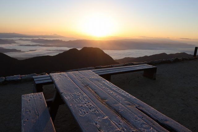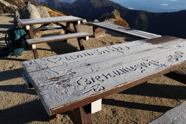 この霜はベンチにはまるで雪が積もったかのようにびっしりと付いていました。その落書きをよく見て見るとタイ語と思われる落書きもありました。ここ最近、10月になるとタイの方が多く来られるようになってきています。落書きにも今のインバウンドの方々の多さが現われています。