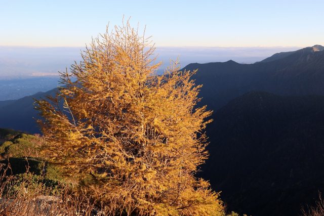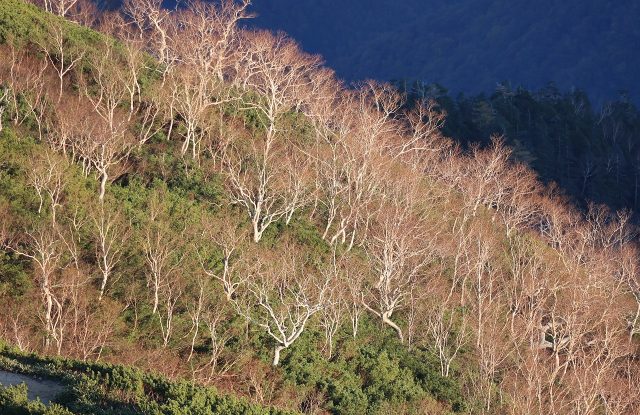 日の入りは16時台に入ってきていて、16時を過ぎれば太陽の日差しは大きく傾いてきます。その西日を受け、すっかり木の幹だけとなったダケカンバや落葉の始まり出したカラマツの黄金色がとてもきれいでした。