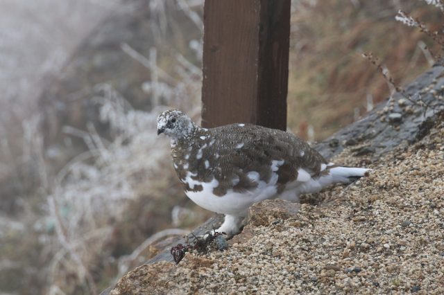 そんな天気の中、1羽のライチョウがサンルームの前に姿を見せてくれました。もこもことした羽毛を着て、とても暖かそうでした。