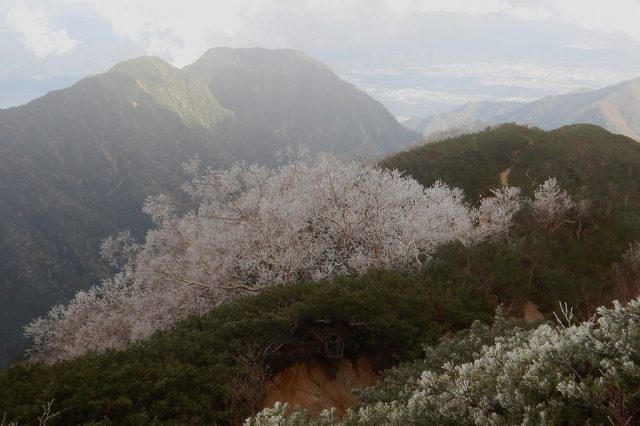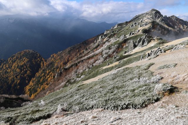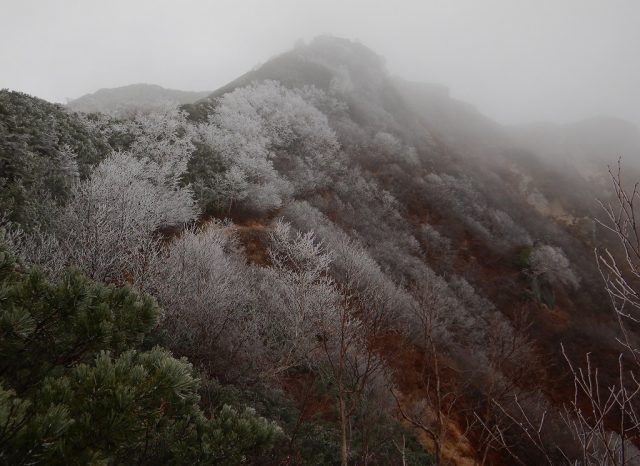 燕山荘に近づくにつれ、霧氷が見られるようになってきました。この秋、最初の霧氷です。まるで白い花が咲いたようできれいでした。