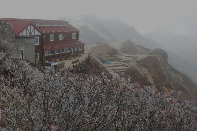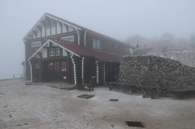 積雪というほどの雪ではありませんでしたが、薄っすらと白くなってきました。燕山荘の初雪です、冬の訪れですね。明日はさらに寒さの厳しい一日となりそうです。