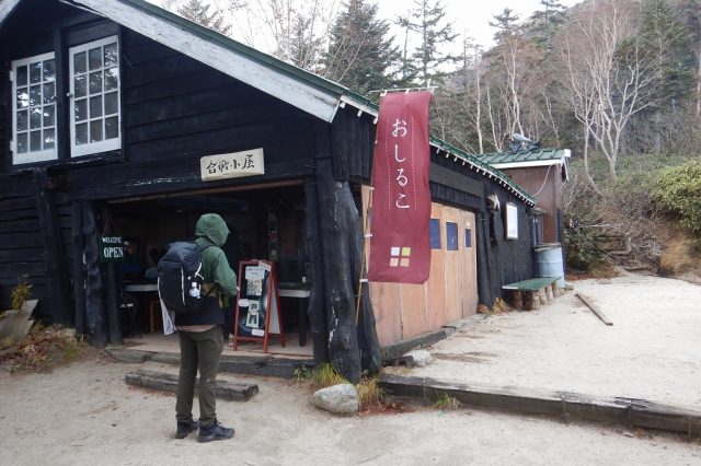上の方では雪が降っているのか、お昼過ぎに合戦小屋まで来ると時折白いものが風に運ばれて来ました。合戦小屋も少しづつ冬仕様になってきて、片面にはコンパネが張られ、休憩スペースがだいぶ暖かくなっていました。こんな寒い日はお汁粉を食べて、エネルギー補給がいいですね。寒くなってくると行動食をあまり摂らなくなりがちですが、寒い時こそエネルギー源となる食べ物は大切なものとなってきます。