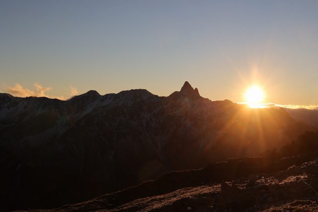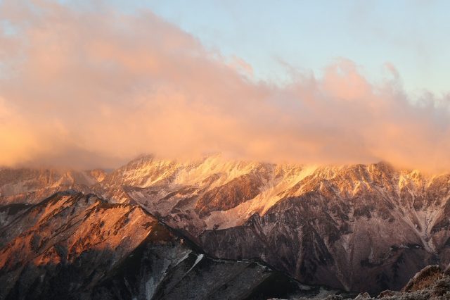 穂高連峰、焼けた空をバックに1枚パシャリ、お写真を撮らせていただきました。