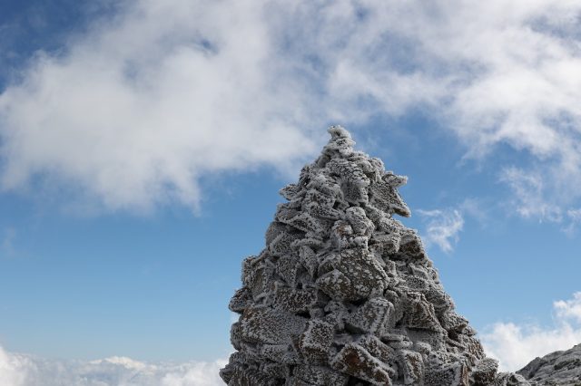 小屋前のケルンも、なんだかクリスマスツリーの様。