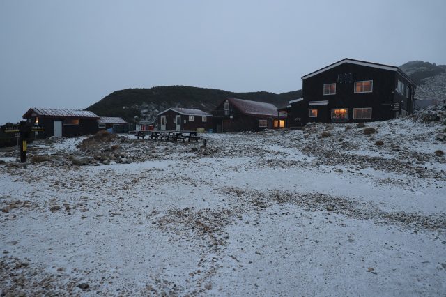 夕方17:30現在、大天荘の温度計で-2.1℃、雪が降り出しました。