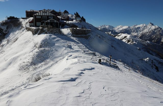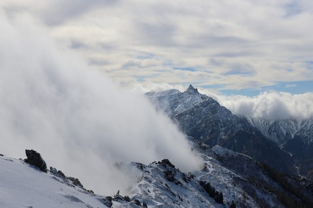 しかし、荷上げが始まって一便目が終わる頃、安曇野側には雲が湧き上がって来て、あっという間にガスで真っ白になってしまいました。夏と同じで安曇野側の気温が高かったためなのでしょうか。荷上げは明日へ順延となりました。