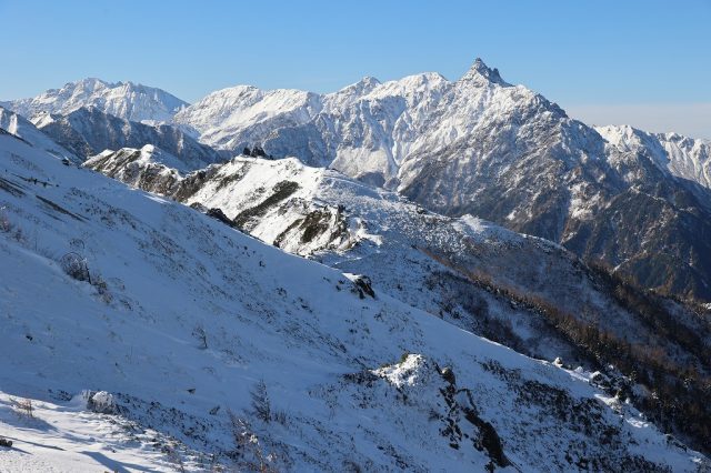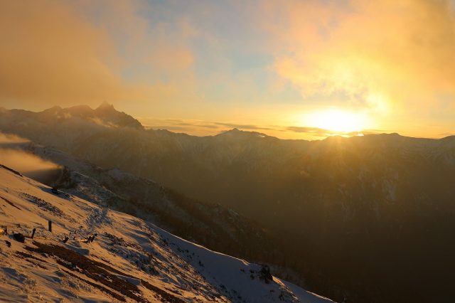 朝日が裏銀座の山々を照らし出してくる頃、月は真砂岳の上へと沈んでいきました。月の入りは日の出と違ってあまり見ることがなく、ちょっとうれしい気分になりました。