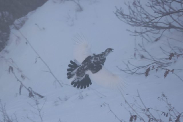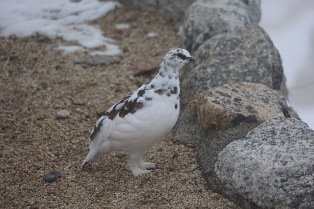 ガスで真っ白な中、グエーグエーという声が聞こえたので、そちらの方へ目をやるとライチョウの姿がありました。2羽は冬毛がだいぶ増えているようでした。もう1羽はまだ黒い部分がだいぶ残っていました。今日は小屋の周辺で4羽のライチョウを見かけました。みんな今年生まれたライチョウなのでしょうか。親が途中でいなくなってしまい、5羽のヒナたちだけでエサを食べている姿は何とも言えないものでした。無事に育っててくれるとうれしいのですが。