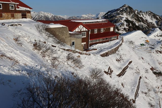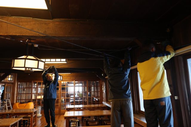 物資輸送による荷物を片付けた後は、冬支度の作業を進めます。今日は食堂内に雪の重みにより小屋のねじれを防ぐための金具を付けました。日毎に小屋の内外の風景は冬のものへと変わっていきます。