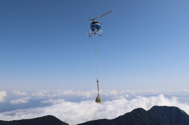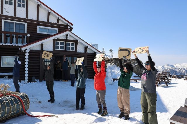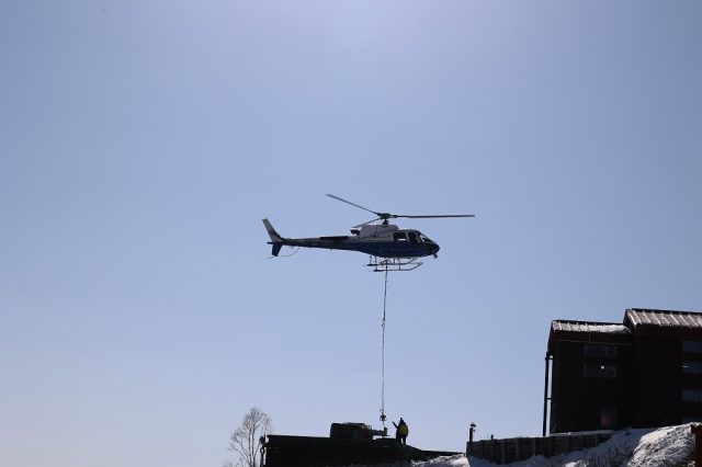 その心配した強風も10時頃には弱まってきて無事に物資は届き、また、ゴミや不用品を全て下ろすことが出来ました。今シーズンも無事にヘリコプターによる物資輸送が終わり、まずは一安心。最後はスタッフが手作りのプラカードでお礼を。このヘリコプターによる物資輸送が無ければ、山小屋は成り立ちません。東邦航空の皆様どうもありがとうございました。また、たくさんの物資を届けて下さった業者の皆様本当にありがとうございました。